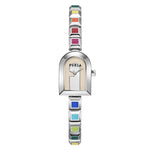 A dash of color and the geometrical shape make the FURLA Arch case instantly recognisable. The silver tone case with light pink dial is set with a silver bracelet brightened by rainbow enamel. The easy adjustable links helps to obtain just the right fit for this elegant wrist accessory.