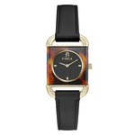 Furla Arco Square is a rectangular watch with a yellow gold PVD case with tortoiseshell acetate. A minimalist sunray dial matches the black leather strap. This unique timepiece embraces all of the beautiful and bold elements of Furla.