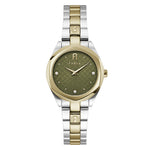 This elevated timepiece features an unusual face in deep olive green, textured with a tiny repeat pattern of the Furla Arch logo and set with three bezel-set, white crystal indices. The faceted, six-sided bezel of yellow gold plate over stainless steel adds an architectural edge to the round case, with vintage-style arrow hands. The substantial multilink bracelet features the Furla Arch logo inscribed on the center element of golden links.