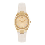 Bold, beautiful silhouette pairs timeless elegance with of-the-moment style. Bright white crystals set in gold-toned stations mark the hours, mirrored by the 12-sided bezel in brushed steel with a golden-colored finish. The face is subtle printed with the iconic brand logo, fitted with a luxurious marshmallow-white leather strap that echoes the signature graphic.