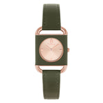 Geometry guides this fabulously contemporary timepiece, with a sophisticated rectangular leather-wrapped case with soft corners crafted in rose gold-tone steel for a feminine flair. A petite, round rose gold dial crowned with the Furla Arch logo, accented with three hour markers centers within the case. Absolutely gorgeous with a luxurious green leather strap.