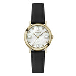 Opposites attract in this irresistible timepiece that brings together the cool sheen of glossy white mother-of-pearl, the luster of yellow 14k gold plating, and sleek black leather. The natural shell dial is brilliantly lit by round and baguette-cut crystal indices set in gold-plated dazzle for added definition, swept by golden hour and second hands.