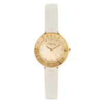 This is a flawlessly chic timepiece. The gold-tone round dial is subtly printed with the Arch Logo pattern, set in a lustrous round bezel of blushing gold-tone, circled with the Furla brand name and three brilliant white European crystals. A gold finish matches the hands to the markers, and four fiery white crystals mark the 3,6,9 and 12 coordinates. Keep it sporty with a slim band of premium marshmallow-white Italian leather, embossed with the Furla Arch logo.