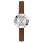 This is a flawlessly chic timepiece. The silver round dial is subtly printed with the Arch Logo pattern, set in a lustrous round bezel of blushing Silver tone, circled with the Furla brand name and three brilliant white European crystals. A rose gold finish matches the hands to the markers, and four fiery white crystals mark the 3,6,9 and 12 coordinates. Keep it sporty with a slim band of premium brown Italian leather, embossed with the Furla Arch logo.